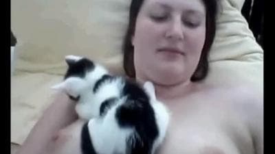 Gruba dojrzała brunetka rozmawia przez telefon z kochankiem i podniecona masturbuje się i pieści palcami głodną pizdę, do towarzystwa ma też kotka.