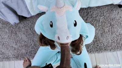 Słodka nastoletnia Stephie w kolorowej piżamce w unicorny obciąga kutasa swojego ojczyma i dostaje mocne pierdolenie w pov, zobacz w jakich pozycjach!