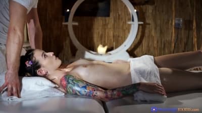 Piękna wytatuowana Kylie Nymphette pokocha ten masaż, gdy naoliwi jej sutki i cipkę, aby ją podniecić, a nawet sprawi, że będzie ssać kutasa.