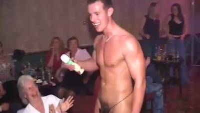 Atrakcyjny młody stripteaser występuje w klubie pełnym podnieconych ubranych kobiet pozwala się im dotykać a nawet pieścić i obciągać chuja, gorąco!