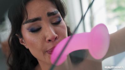 Cycata latynoska Samie Duchamp ssie duże różowe dildo, a następnie ssie wielkiego kutasa Yeri Blue, jednocześnie pieprząc się z dildo!