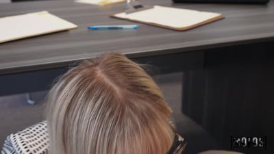 Po ukryciu się pod biurkiem, Katee V wstaje i pozwala swojemu współpracownikowi Tony'emu Rubino podciągnąć jej spódnicę i pieprzyć ją od tyłu