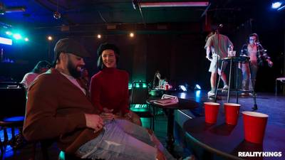Evelin Stone urozmaica nudny i nudny slam poetycki, masując swoją cipkę przez James Angel pod stołem, wyciągając i ssąc jego kutasa
