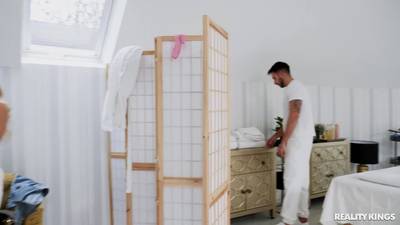 Blondynka Maya Rose rozbiera się dla masażysty Francisa X, a jej duże cycki i cipka są nacierane olejkiem. Ssie jego kutasa i palcuje swoją cipkę