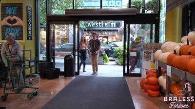 Jej cycki są dobrze widoczne przez prawie przezroczystą bluzkę, którą ma na sobie. Jest ekshibicjonistką i dlatego lubi chodzić na zakupy w ten sposób