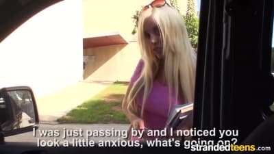 Seksowna blondynka z dużymi cyckami wsiada do auta faceta, który chce jej pomóc bo spóźniła się na autobus. Za podwózkę zapłaci mu obciąganiem i rżnięciem!
