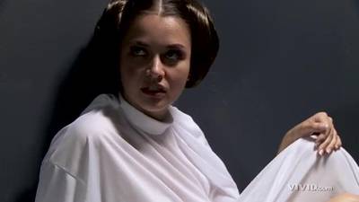Złapana przez Dark Vador, księżniczka Leia próbuje go zwyciężyć seksem! Masturbuje się a potem obciąga wielkiego czarnego kutasa przez ścianę w parodii!