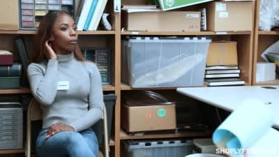 Ta młoda czarna pracownica została złapana na kradzieży i musi ponieść karę. Obciągnie kutasa starego ochroniarza i da się wyruchać od tylu aż facet się spuści.